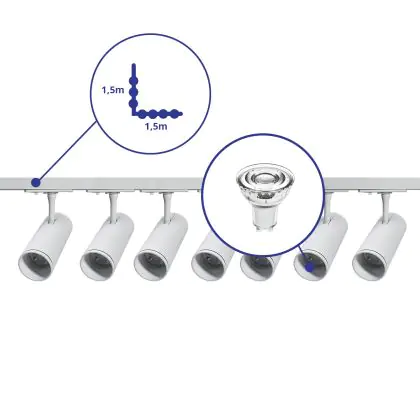 Beschrijving Complete Set 1-Fase Rail L 1,5 x 1,5 Meter Wit | incl. 7x Spot + GU10 2700K 3W Dimbaar + Eindkap, Voedingsconnector en L -Verbindingsstuk