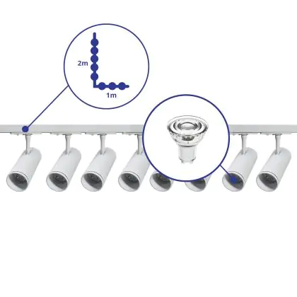 Beschrijving Complete Set 1-Fase Rail L 1 x 2 Meter Wit | incl. 8x Spot + GU10 2700K 3W Dimbaar + Eindkap, Voedingsconnector en L -Verbindingsstuk