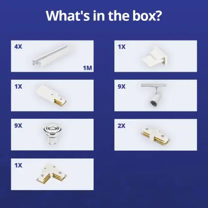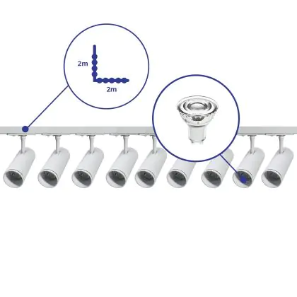 Beschrijving Complete Set 1-Fase Rail L 2 x 2 Meter Wit | incl. 9x Spot + GU10 2700K 3W Dimbaar + Eindkap, Voedingsconnector en L -Verbindingsstuk