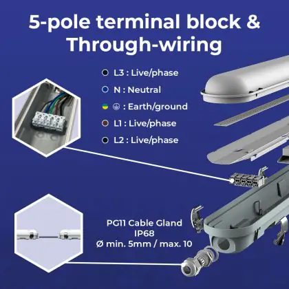 Beschrijving Noxion LED Waterdichte Montagebalk Poseidon V3.0 35-65W 4550-9100lm - 830-865 CCT | 150cm - Doorvoerbedrading (5x2.5mm2) - 3 Uur Noodverlichting