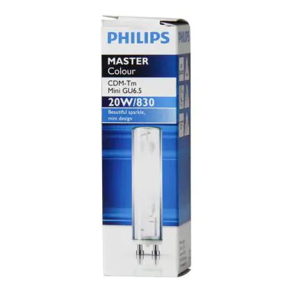 De Philips CDM-Tm Mini kenmerkt zich door de goede kleurweergave (>90Ra) en een kleurtemperatuur van 3000K.De Philips CDM-Tm Mini 20W 830 GU6.5 (MASTERColour) gasontladingslamp heeft een eenvoudige lampvoet, namelijk de GU6.5. De lampen zijn niet dimbaar.